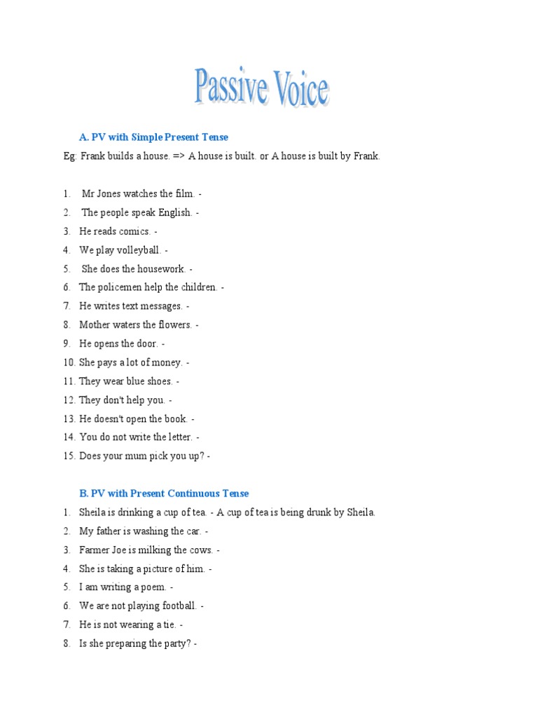Tenses Active And Passive Voice Worksheet from files.liveworksheets.com A sentence is said to be in passive voice if the subject is acted upon, or, is passive while the action is done to it, as in: The way these sentences are made make a lot of difference in writing and we are going to learn all about that in this chapter. This football team must play the match. The verb (are playing) is replaced by the same tense, and suitable number, of the verb 'to be' plus the past participle of the verb. If you don't like that analysis, you can alwa. Sheila is drinking a cup of tea.= a cup of tea is being drunk by shelia. Subject + verb (s or es with singular noun) + object… passive: Tom bought a nice present yesterday.